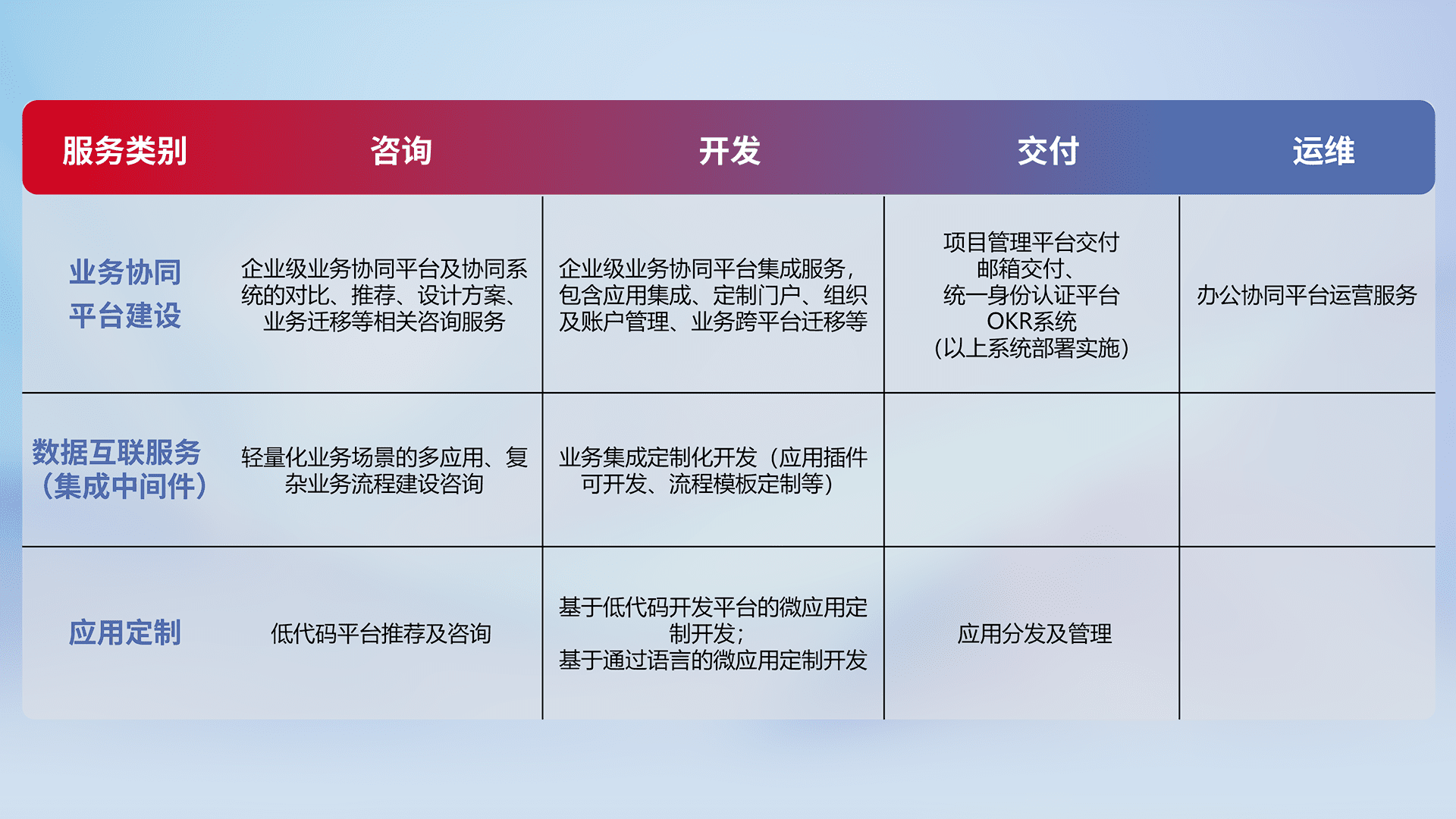针对钉钉、、企微、、、IDaas等平台级产品提供产品的规划、、、、方案、、、交付、、、、定制化开发等服务,,实现如统一协同办公、、、智能客户服务、、、、混合会议管理、、智能数据查询、、、等业务场景,,实现数字化转型。。。。